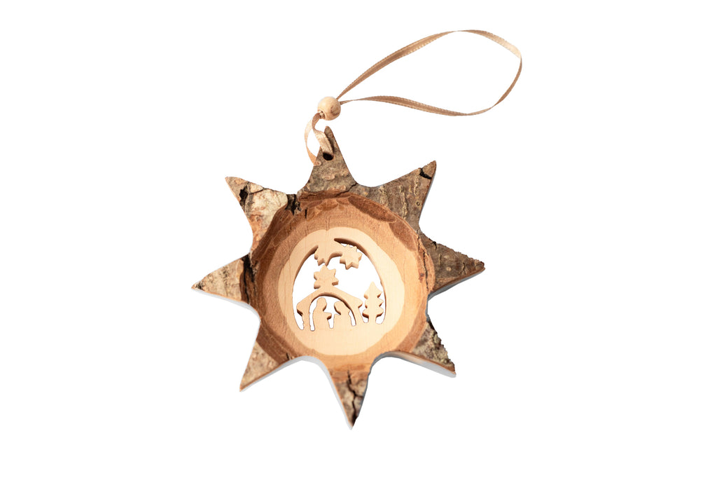Šis išskirtinis kalėdinis žaisliukas yra pagamintas iš medžio. Jo formą primenanti žvaigždė simbolizuoja Betliejaus žvaigždę, kuri nuvedė piemenis ir išminčius pas Kūdikėlį Jėzų. Viduryje išpjaustytas Šventosios Šeimos atvaizdas – Marija, Juozapas ir Kūdikėlis Jėzus – švelniai primena apie tikrąją Kalėdų prasmę. Žaisliukas turi raištelį, tad patogiai kabinasi ant eglutės ar gali tapti dailia interjero detale.