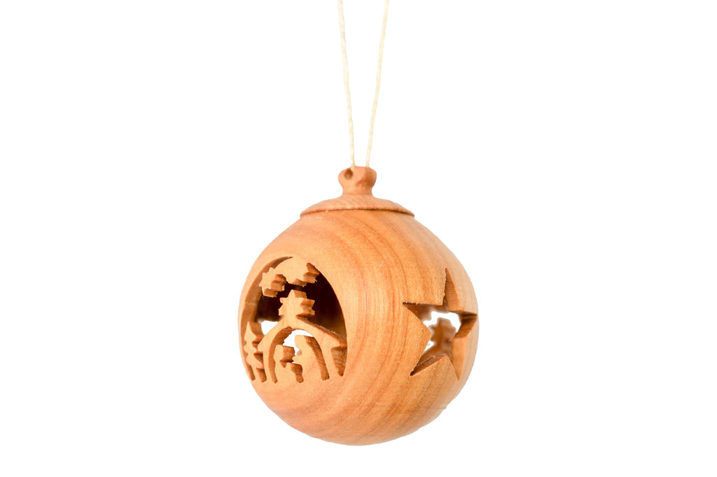 Šis medinis rutulio formos kalėdinis žaisliukas yra ypatingas savo prasme ir išskirtiniu dizainu. Jo šonuose išpjaustyta prakartėlės scena – Šventoji Šeima po Betliejaus žvaigžde, apsupta eglučių. Kitoje pusėje spindi žvaigždės motyvas, leidžiantis šviesai prasiskverbti pro medį ir sukurti jaukią atmosferą. Natūrali medžio spalva bei kruopštus išpjaustymas suteikia žaisliukui elegancijos ir autentiškumo.
