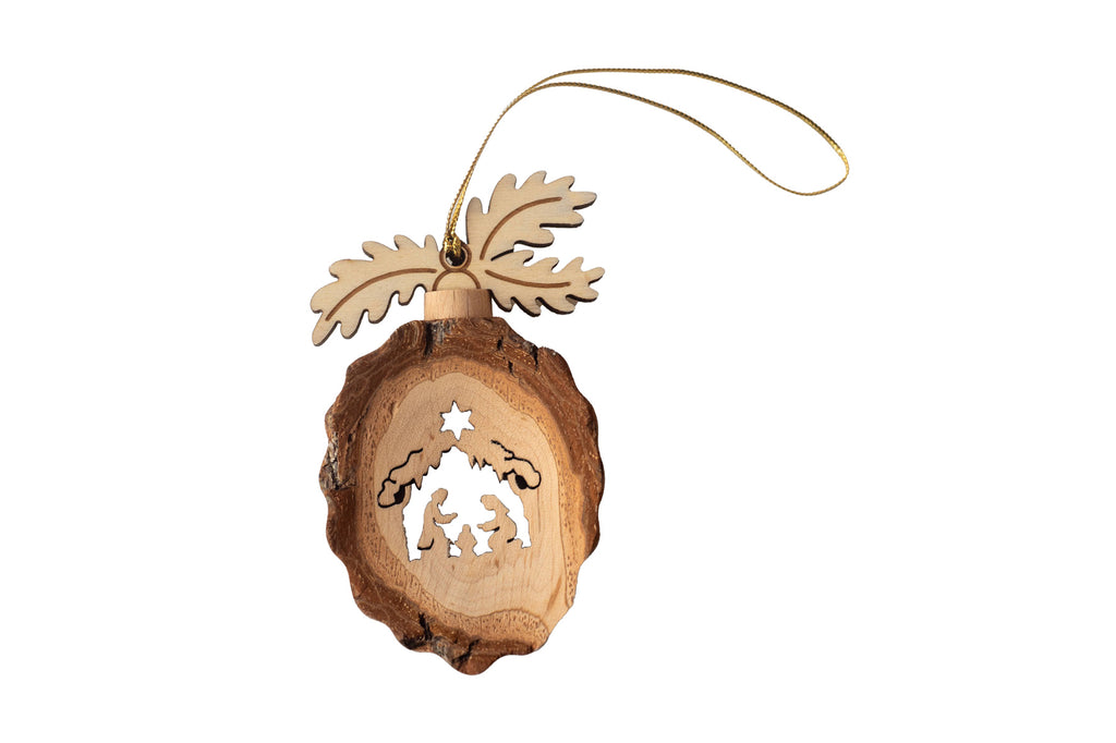 Šis medinis kalėdinis žaisliukas alsuoja natūralumu ir šiluma. Jo centre išpjautas prakartėlės vaizdas su Kūdikėliu Jėzumi, Marija ir Juozapu primena apie pirmąsias Kalėdas ir tikrąją jų prasmę. Medžio rievės suteikia gaminiui autentiškumo, o viršuje pritvirtintos stilizuotos lapų detalės papuošimui prideda elegantiško lengvumo. Auksinė juostelė leidžia patogiai pakabinti žaisliuką ant eglutės, lango ar net automobilio veidrodėlio.
