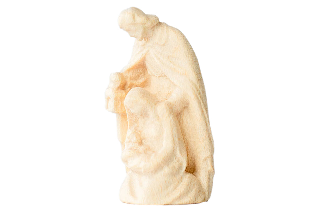 Ši nedidelė medinė prakartėlė subtiliai perteikia Šventosios Šeimos artumą ir meilę. Marija švelniai laiko Kūdikėlį Jėzų, o Juozapas stovi šalia, globėjiškai lenkdamasis prie jų. Paprastos, bet išraiškingos linijos sukuria ramybės ir susikaupimo įspūdį, o natūrali medžio spalva suteikia jaukumo ir šilumos.