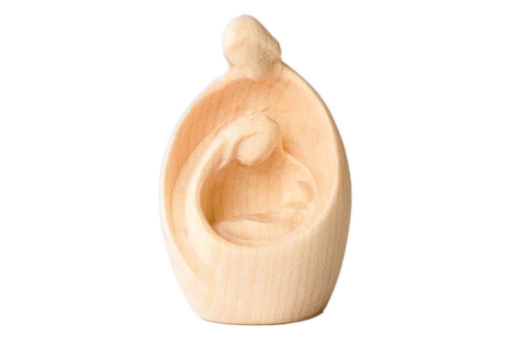 Ši medinė prakartėlė pasižymi minimalistiniu dizainu, kuris subtiliai perteikia Šventosios Šeimos artumą. Lenkto silueto formoje susilieja Juozapas, Marija ir Kūdikėlis Jėzus – jų figūros, nors ir abstrakčios, aiškiai atskleidžia meilės, globos ir švelnumo žinią. Šviesi natūralaus medžio spalva sukuria ramybės ir jaukumo atmosferą.