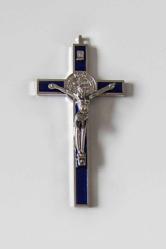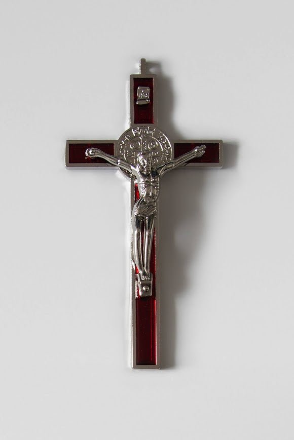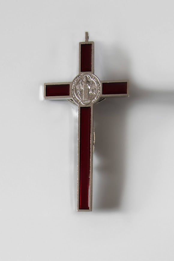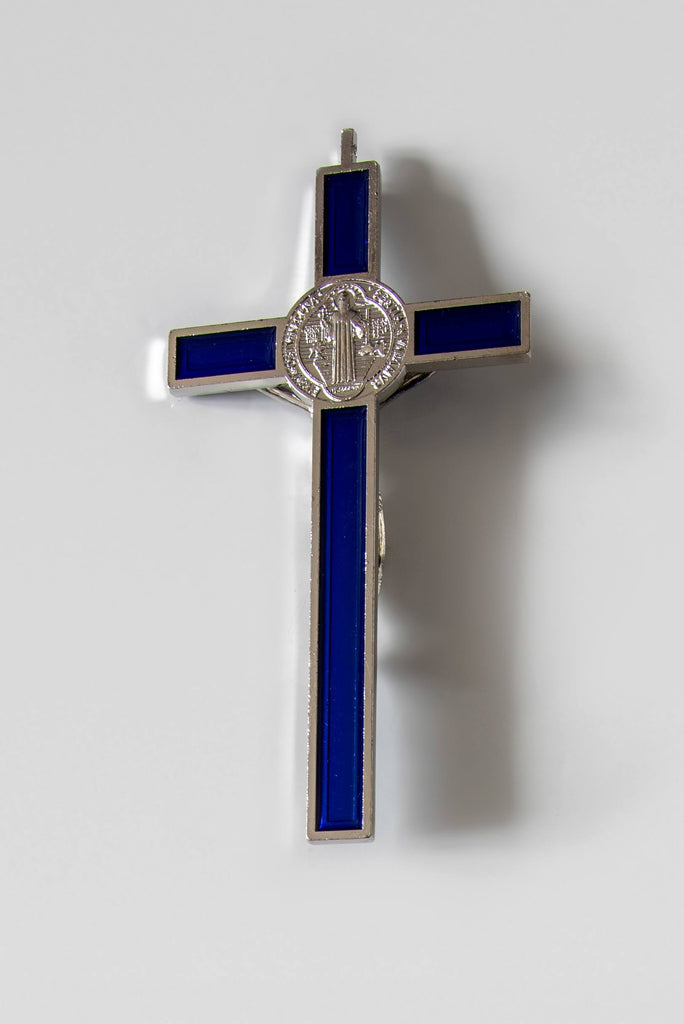 Elegantiškas ir tvirtas pakabinamas kryžius, puoštas originaliu šv. Benedikto medalionu – vienu stipriausių krikščioniškojo tikėjimo apsaugos simbolių. Kryžius turi klasikinę formą, o viduje įlietos spalvotos plokštelės (balta, raudona arba mėlyna) suteikia jam išskirtinį, modernų charakterį.